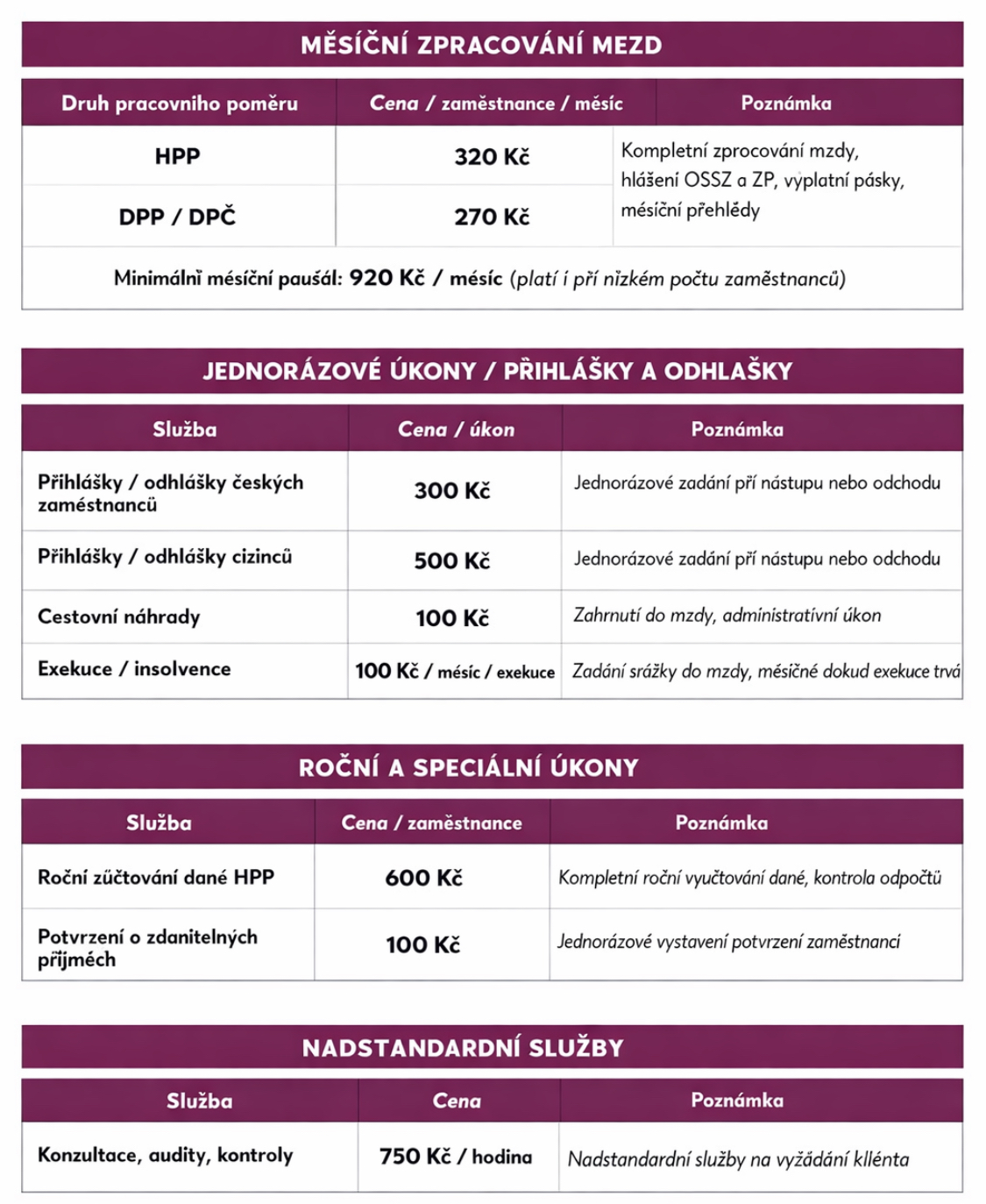 - Převzetí mzdové agendy v průběhu roku: 1 000 - 2500 Kč dle rozsahu